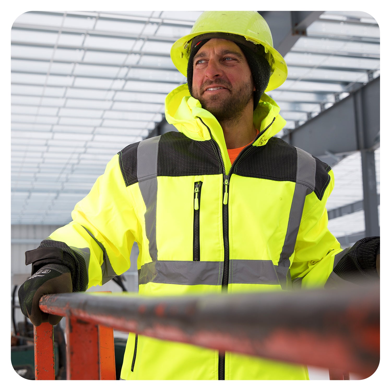 Take on cold, windy job sites with confidence in our GALAXY softshell safety jacket—built for warmth, visibility, and performance. This premium hi vis jacket includes (3) front pockets, (1) clear ID pocket, (1) interior pocket, and a detachable, foldable hood to protect against the elements. The heavy-duty zipper closure and adjustable elastic wrist cuffs help seal in warmth, giving you a secure and flexible fit all day long.