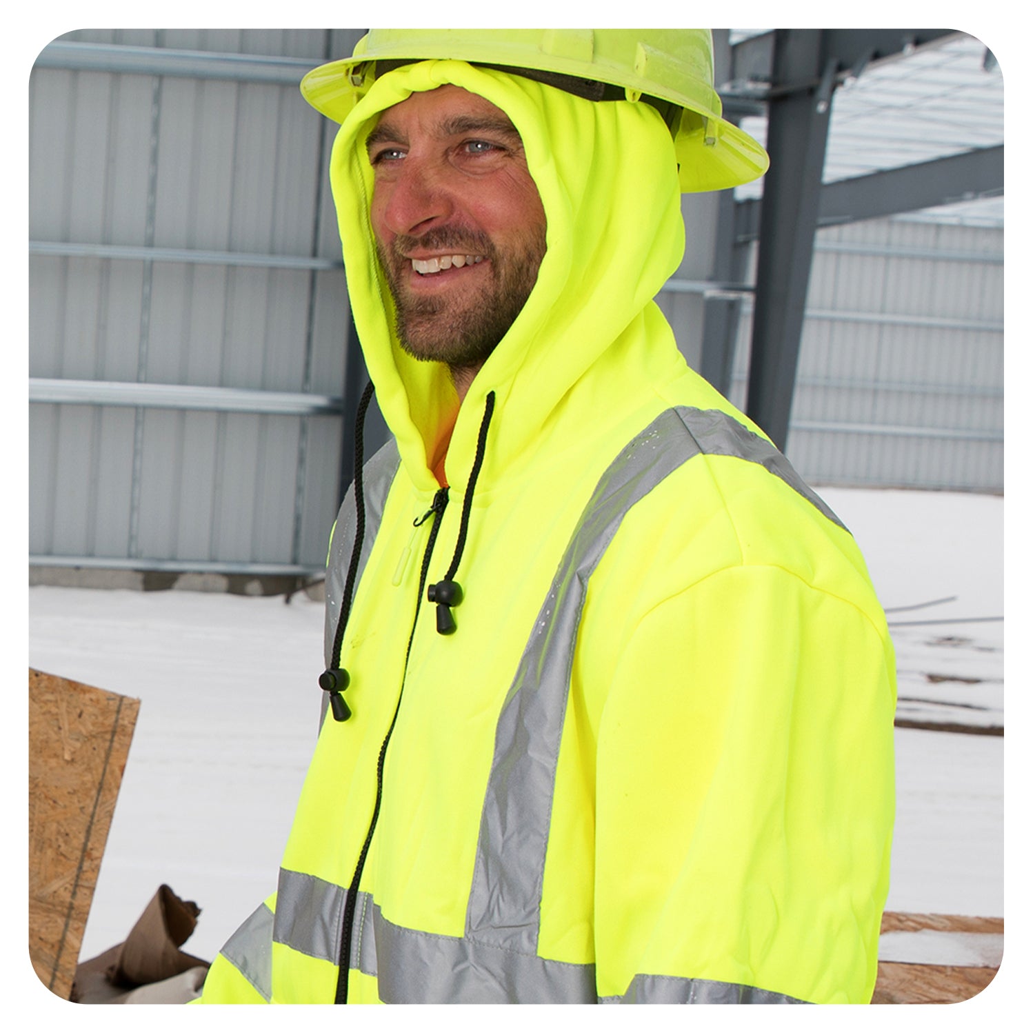 Stay warm, visible, and comfortable with the PATROL safety fleece hoodie—your go-to hi vis layer for cool, low-light job sites. This ANSI-compliant hoodie features a durable anti-pill polyester fleece exterior that resists fuzz balls and fabric shavings, even after frequent washes. A heavy-duty front zipper, two spacious hand pockets, and an adjustable drawstring hood make it both functional and cozy.