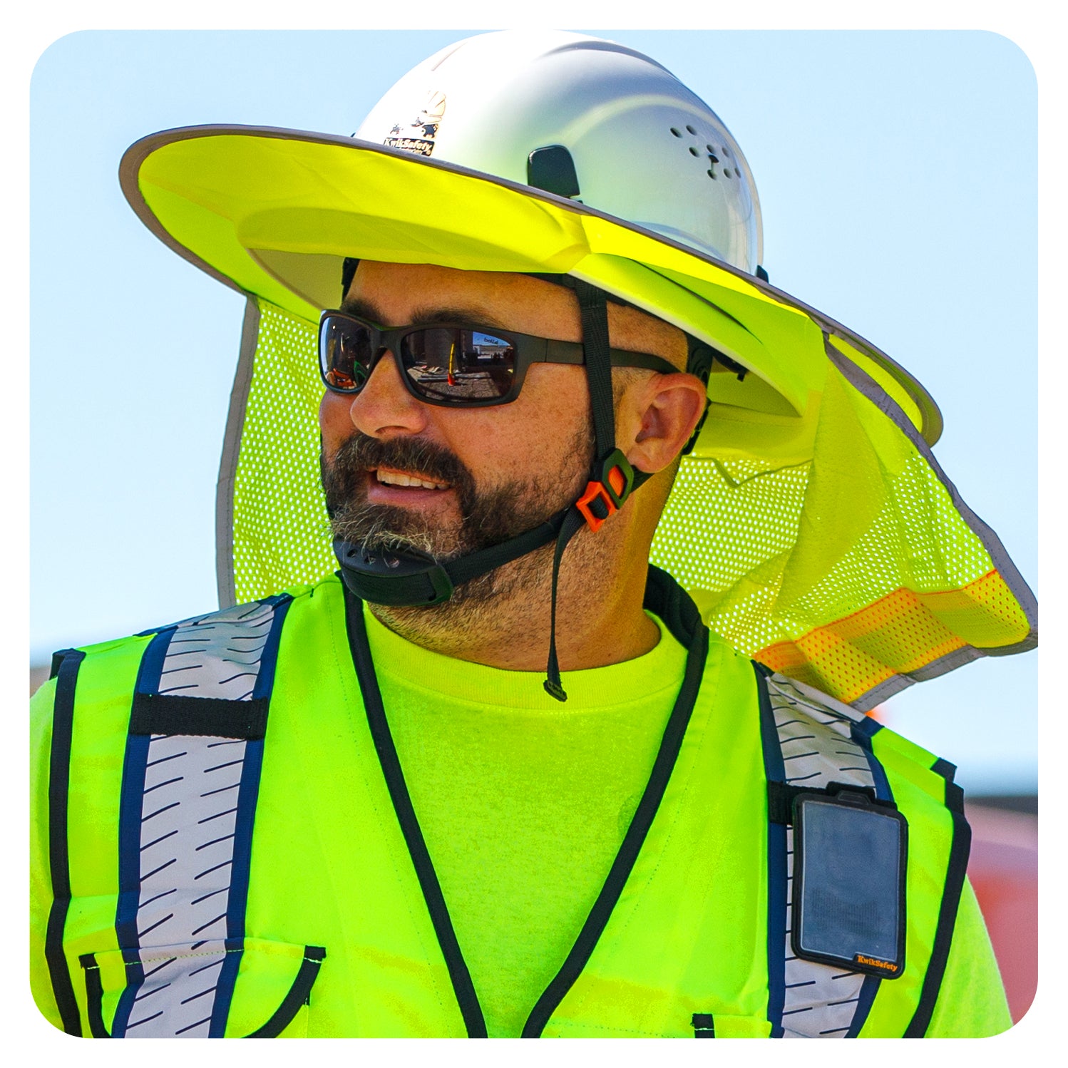 Here at KwikSafety, we offer lightweight, durable, and reflective hard hat shade designs made to fit both full brim and standard hard hats. Our sun shades are built for comfort and visibility in high-heat jobsite conditions.