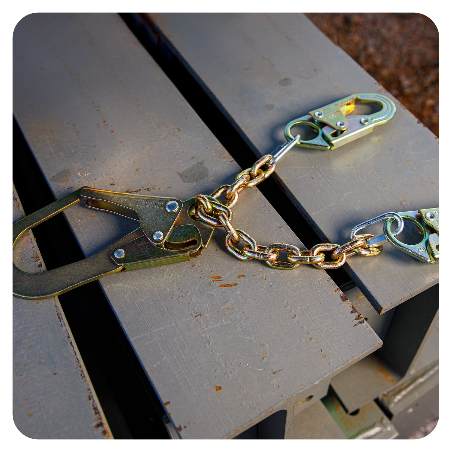 Constructed with a 15-link heat-treated steel chain, the REBAR ROMEO is a premium work positioning lanyard designed for use with safety harnesses or belts with side D-rings. This heavy-duty tool features two steel carabiners and one double-locking rebar hook, all with a 3,600 lb gate strength. Ideal for scaffolding, rebar assemblies, and steelwork, the REBAR ROMEO allows users to lean back and maintain stability while working—without restricting movement. This is not a fall arrest lanyard and does not include a shock absorber.