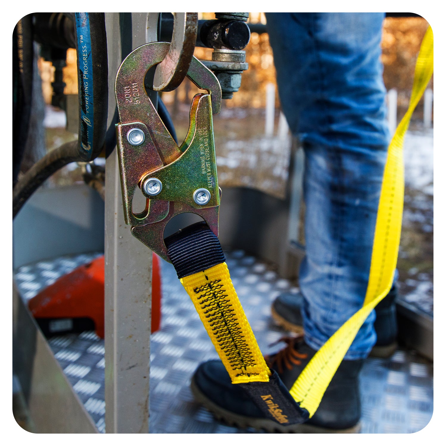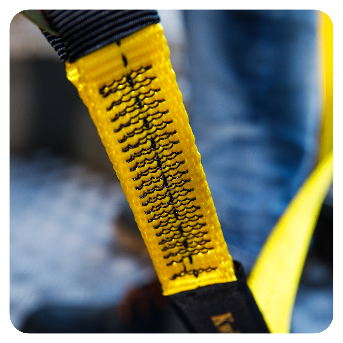Constructed with heavy-duty flat polyester webbing and reinforced black stitching, the DOUBLE LEG TAIPAN Twin-Leg Safety Lanyard is designed for reliable fall protection with an external shock absorber encased in abrasion-resistant plastic. The energy absorber deploys in the event of a fall, extending up to 48 inches to reduce impact forces with an average arresting force of 900 lbs. With its rugged construction and bright yellow webbing, the TAIPAN delivers a dependable combination of visibility, safety, and strength.