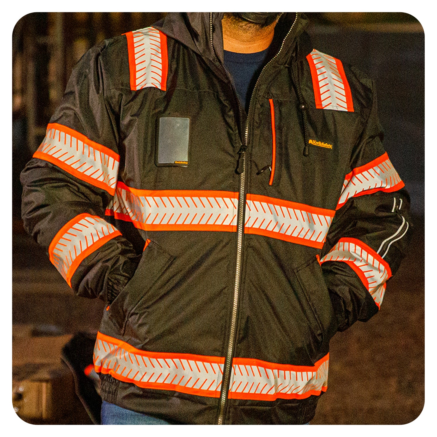 Stand out in bold, tactical style with the BLACK ENFORCER—a premium ANSI-unrated bomber safety jacket engineered for cold weather and tough conditions. This insulated hi-vis coat features a clear ID pocket, (2) front pockets, (1) zippered chest pocket, (1) sleeve utility pocket, and (1) interior pocket for secure storage. A heavy-duty zipper, foldable hideaway hood, and elastic wrist cuffs ensure comfort, warmth, and all-day protection in light rain or wind.