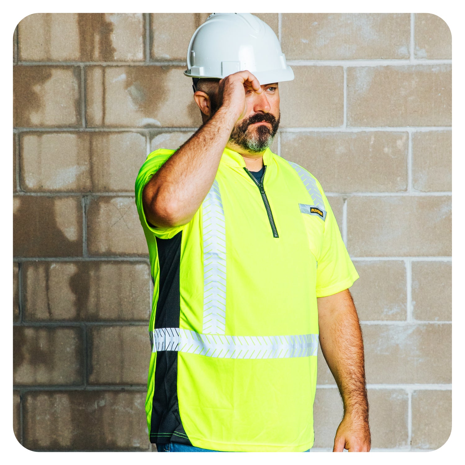 Explore our ENGINEER class 2 safety shirt, built for visibility, comfort, and all-day performance on tough job sites. Made with lightweight polyester and breathable black mesh, this hi-vis shirt features a stylish Y-neck zippered collar and 2" segmented fishbone reflective tape to ensure you're seen in low light and high-traffic areas.