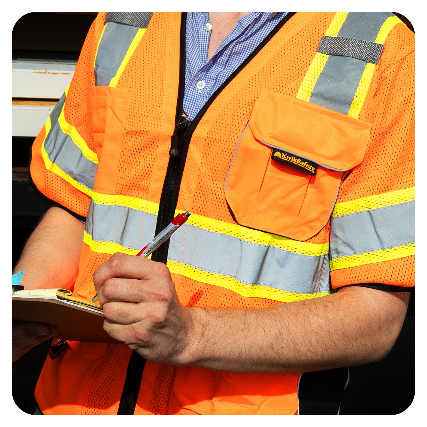 Our EXECUTIVE safety vest includes 10 durable multi-use pockets: (3) large expandable front pockets with secure hook & loop closures, (1) 2-tier phone/tool pocket, (4) pen or pencil pockets, and (2) spacious hidden interior compartments. With added features like mic/radio tabs, a heavy-duty zipper with a fluorescent pull tab, and full-length sleeves for extra visibility, this vest is built to perform in any demanding work zone.