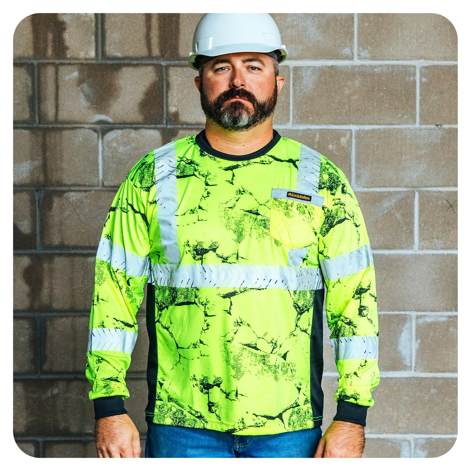 Explore our UNCLE WILLY’S WALL class 3 safety shirt, built for rugged performance with a bold limited edition camo design. Made from high-visibility polyester mesh, this shirt features 2-inch silver fishbone reflective tape, breathable black mesh sides, and sharp black trim to ensure visibility and style on any jobsite.