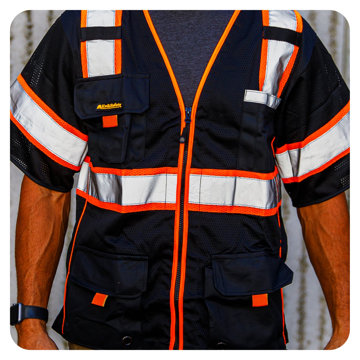 Explore our UNDERBOSS safety vest—built for professionals who demand functionality, storage, and standout style, without the constraints of ANSI certification. This ANSI-unrated black vest features high-contrast orange mesh accents and a breathable design, making it ideal for event staff, logistics teams, or utility workers needing essential gear on the job.