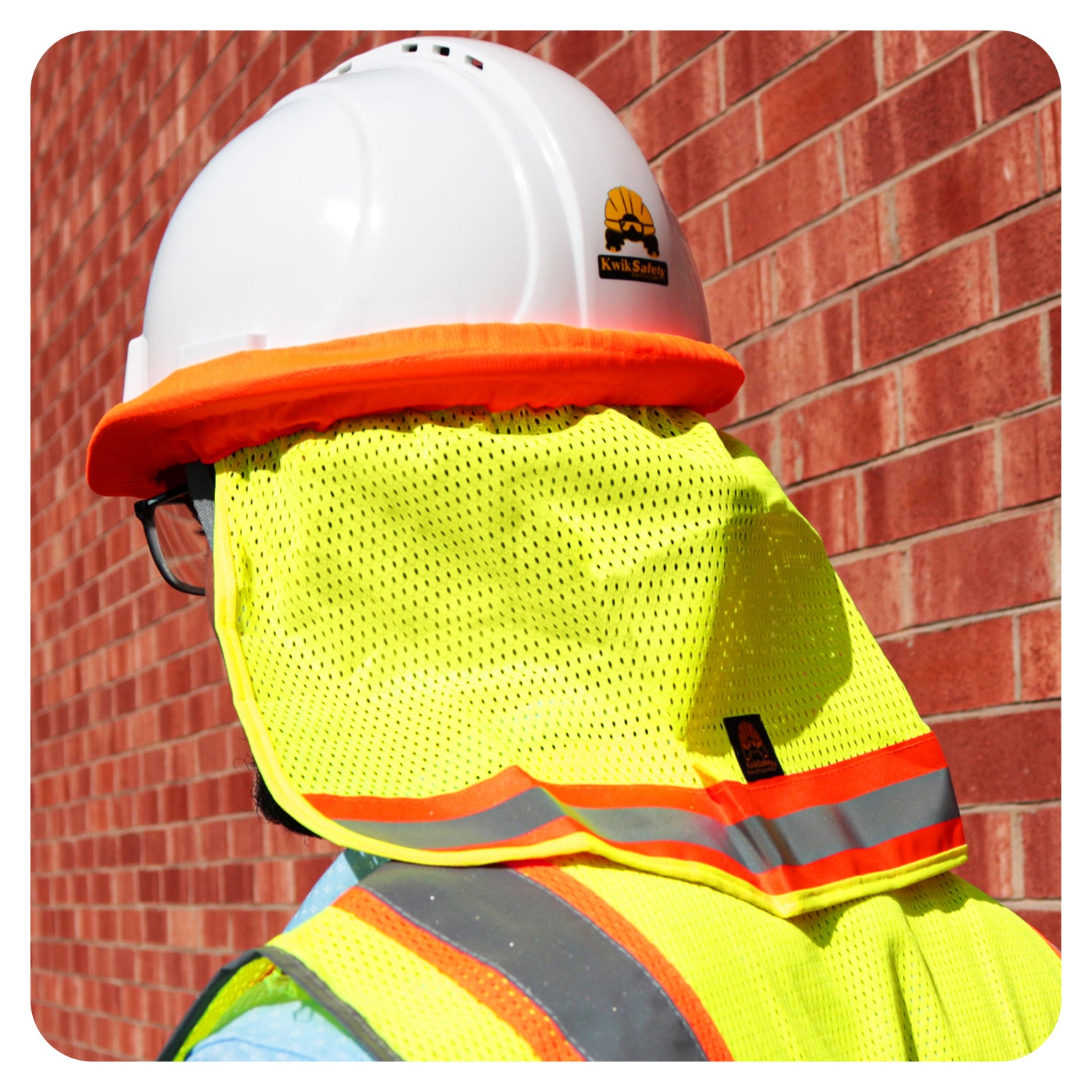 • HARD HAT SUN PROTECTION | HI VIS COOLING MESH - Durable hard hat cover sun shade made of 100% polyester quality woven stitched neon fluorescent reflective yellow safety mesh & orange hard hat sun shade polyester fabric. Hard hat neck shade best fitting size & durable sun protector for hard hat/hats. Brim shade with two tone contrast stripe & 2 inch silver radian retro reflective hard hat sun shade for hard hat reflective tape bands offer greater 360° enhanced visibility & mobility night/day.